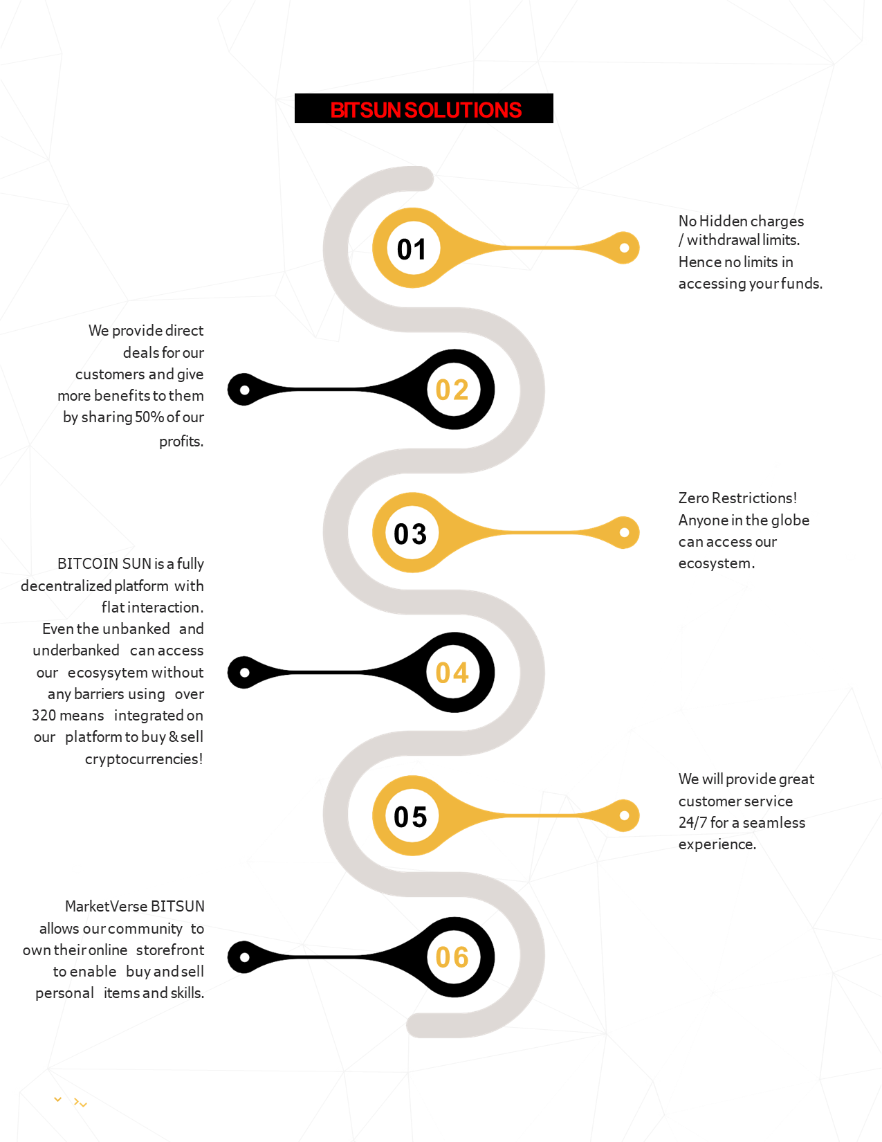 On BITCOIN SUN, our clients will be able to buy or sell crypto using mobile money, gift cards,  mobile top up cards, thrift, cash, prepaid products, money transfer services or even  exchange services or skills for cryptocurrencies. BITCOIN SUN is working with partners to  introduce Crypto-cards on e-commerce websites. Our decentralized Peer-2-Peer platform  aims to intertwine crypto with our day to day lives. We are the gateway to expanding and  growing the capitalization of the entire crypto sector.